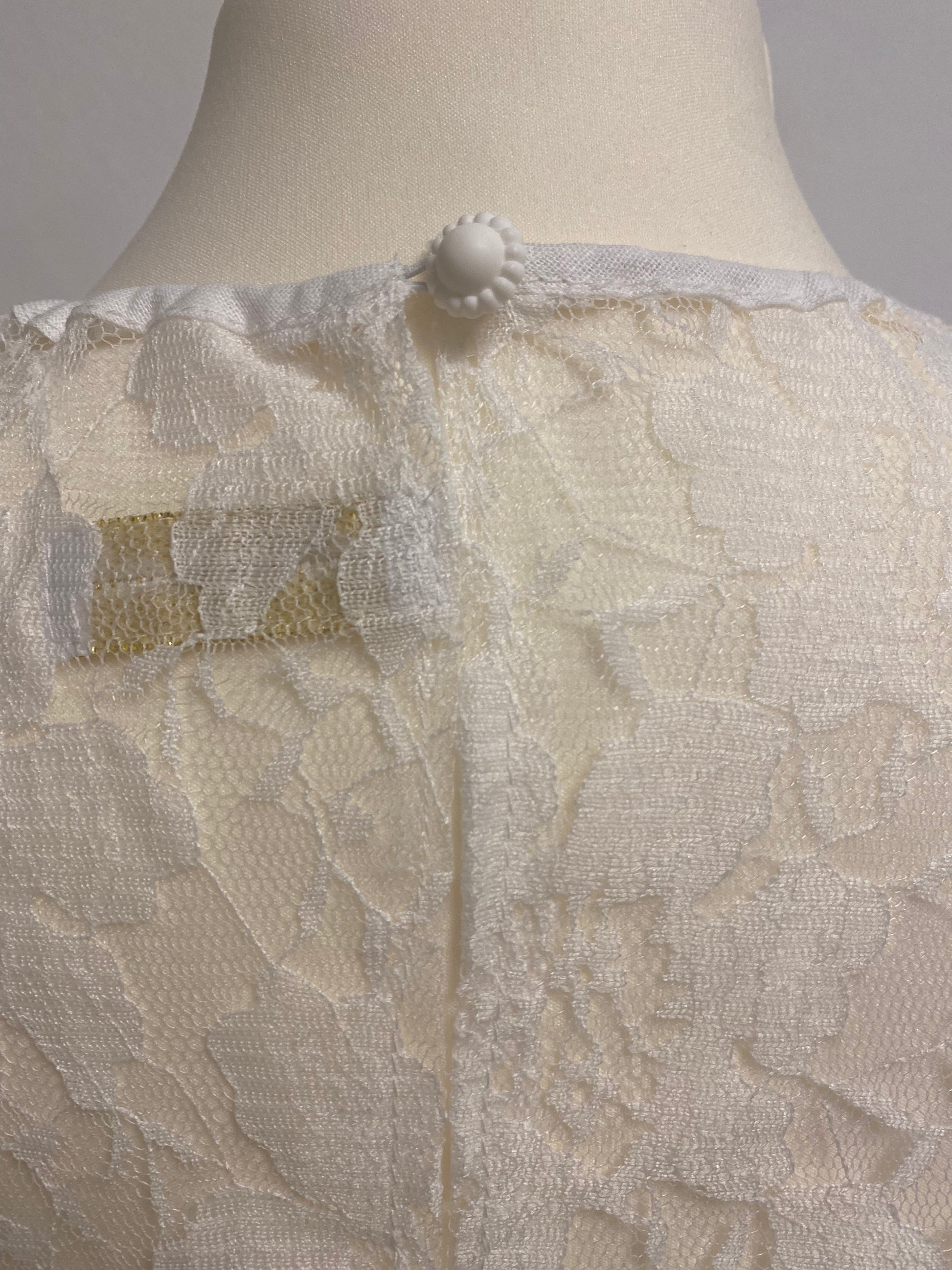 Diese Bluse ist aus einer Tüllspitze mit floralem Muster gefertigt. Der Halsausschnitt ist mit einem Baumwollbändchen versäubert und ist auf der Rückseite mit einem verspielten Blumenknopf zu schliessen. An den Ärmelenden und am Dekoltee ziert ein Gummibändchen die Rundungen und verhilft zu einer schönen Passform.