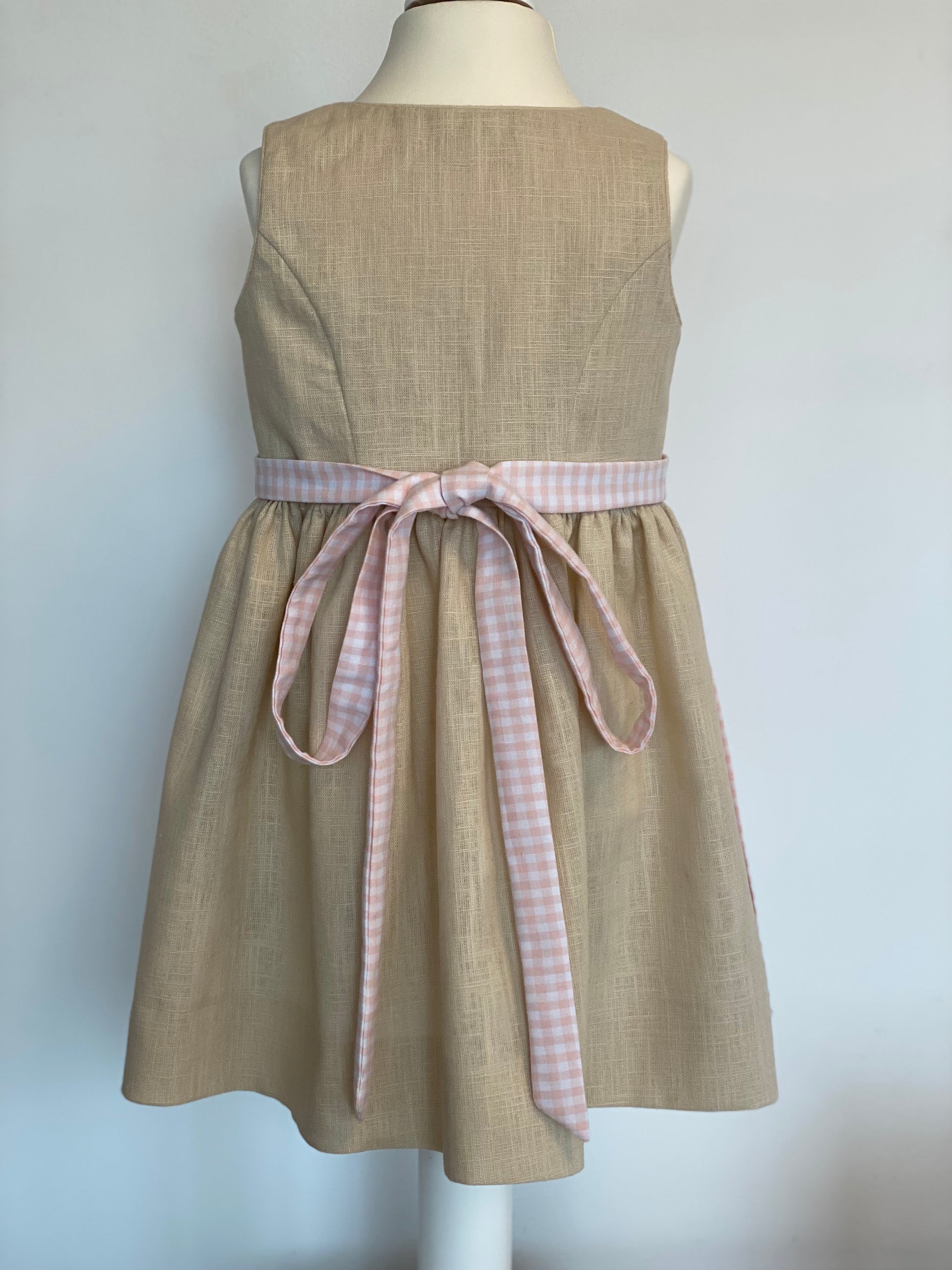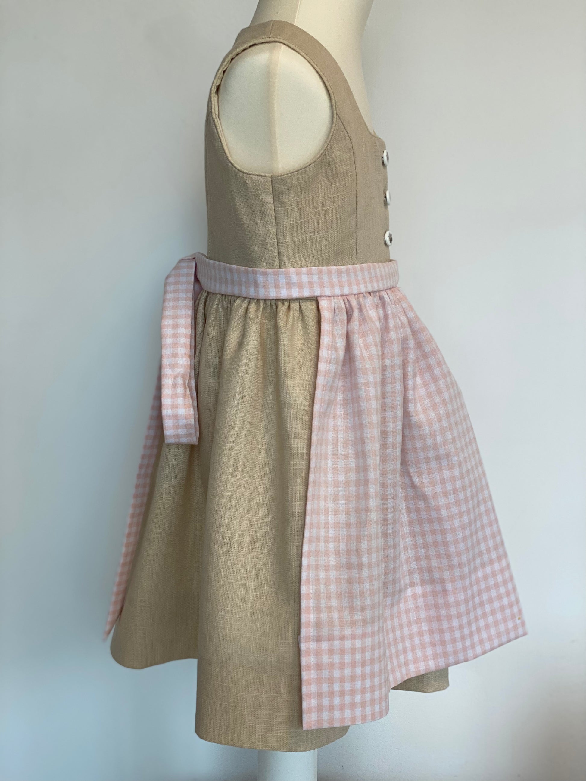 Dirndlkleid aus Ramie, gefüttert mit Baumwolle und die Schürze ebenfalls aus Baumwolle, welche vorne oder hinten mit einer Masche gebunden wird. Zusätzlich habe ich bei der Schürze eine kleine Gummischlaufe eingenäht, zur Fixierung am untersten Knopf. Der Leib ist aufwendig paspoliert und verläuft bis zum Ende der Knopfleiste. Verschluss ist vorne mit Knöpfen. Der Saum beim Rock und der Schürze ist von Hand genäht.