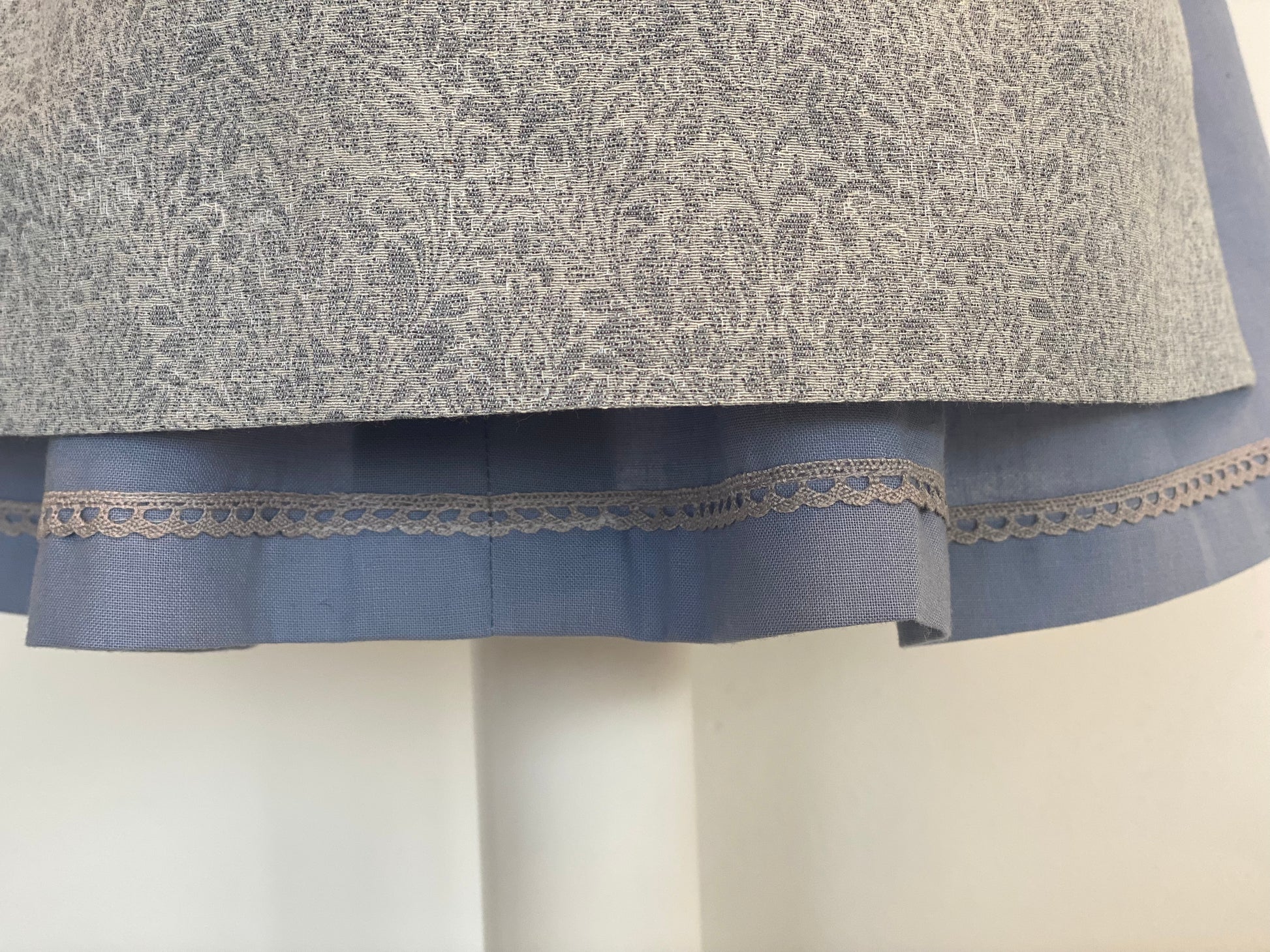 Dirndlleib aus feinem Reinleinen, gefüttert mit Baumwolle, der Rock ist ebenfalls aus Baumwolle und die Schürze von JilSilk, welche vorne oder auch hinten mit einer Masche zu binden ist. Eine kleine verspielte Spitze am Rocksaum ist im selben Farbton wie der Leib. Verschluss ist vorne, etwas verstärkt zur Stabilität und mit Häckchen zu schließen.