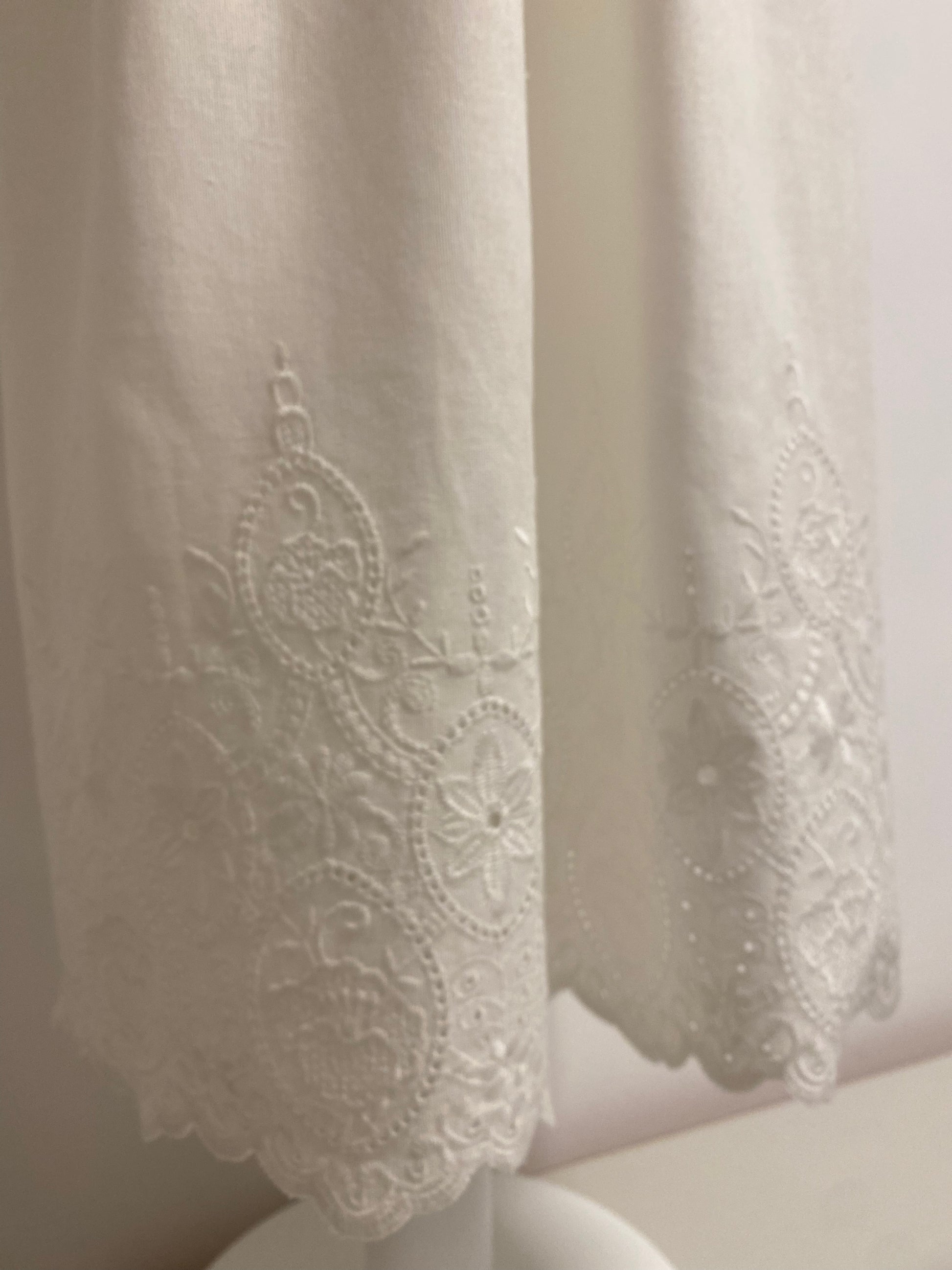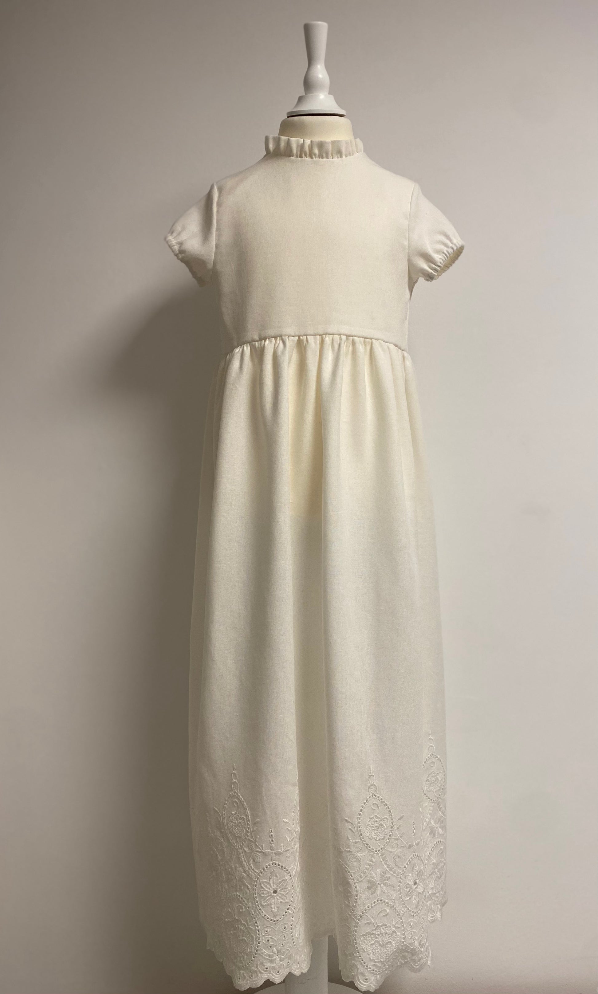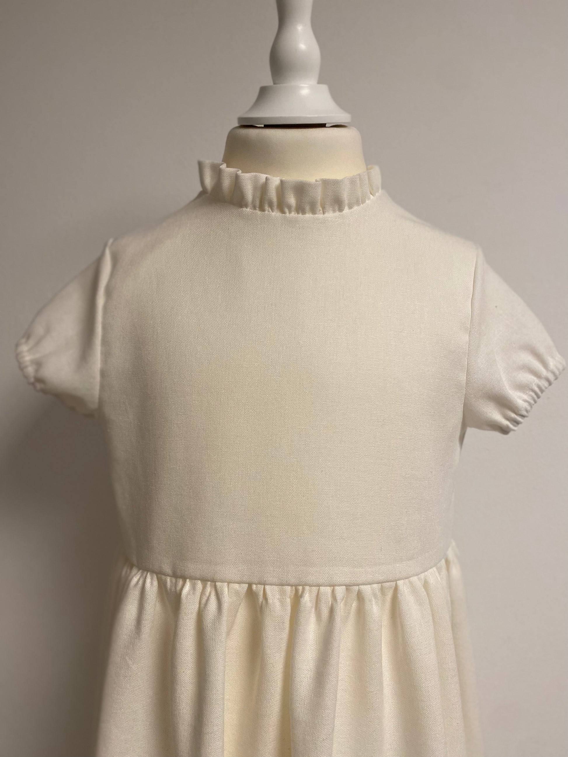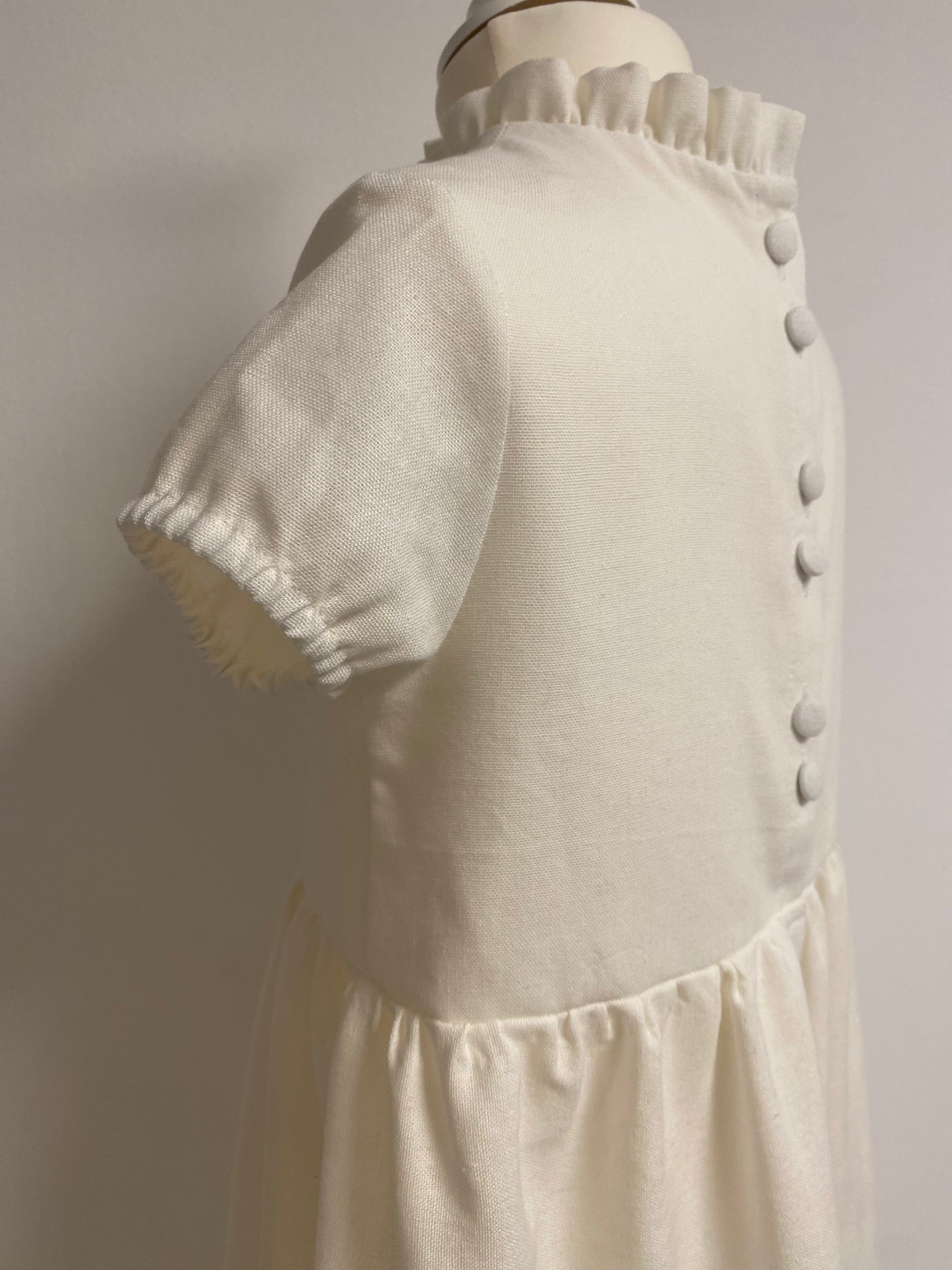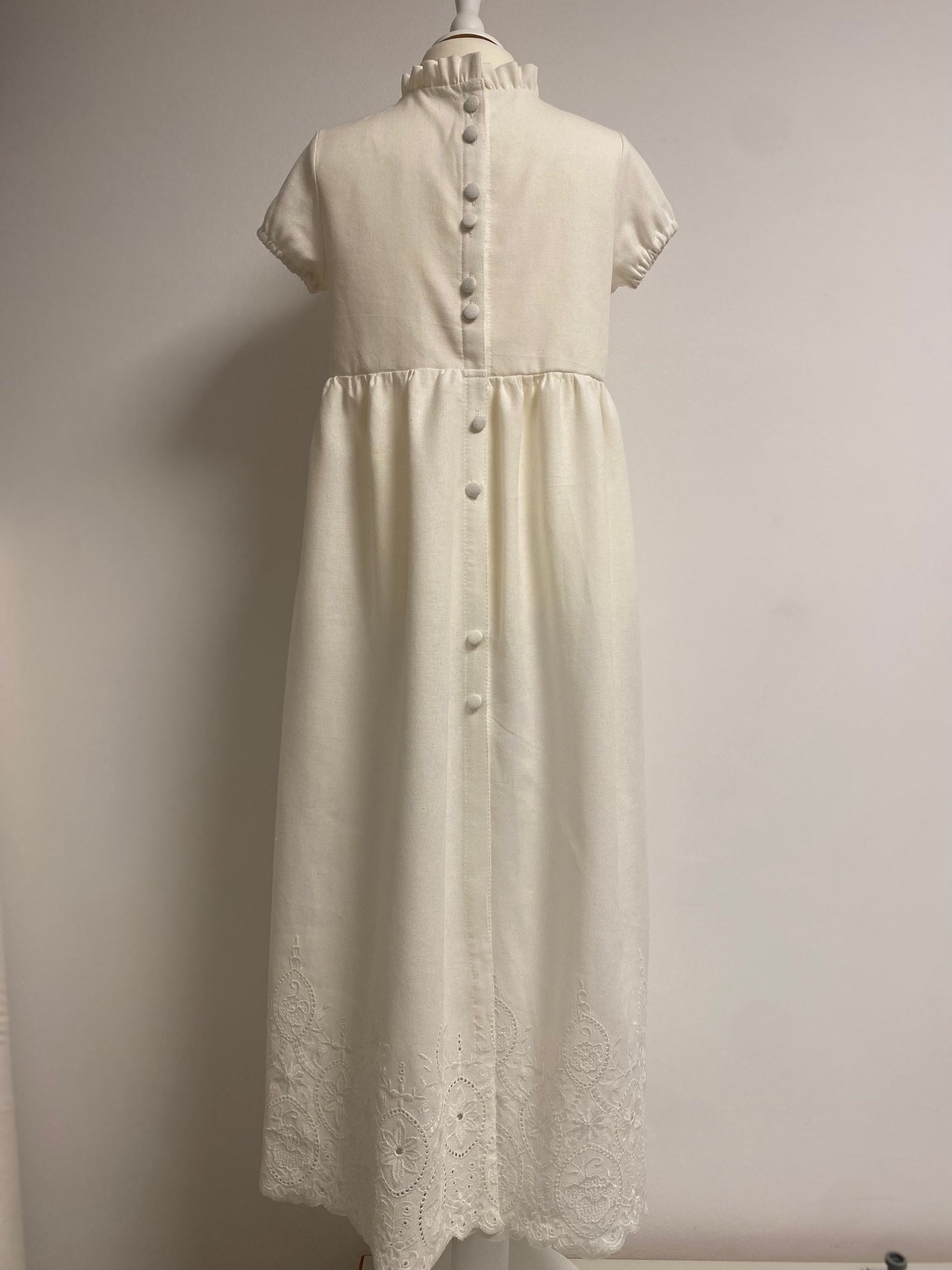 Kleid aus einer Baumwolle-Leinenmischung mit wunderschöner Spitze am Saum. Es fällt sehr leicht. Der Leib ist gefüttert. Die einzigartigen Knöpfe auf der Rückseite sind mit dem Stoff des Kleides ident.