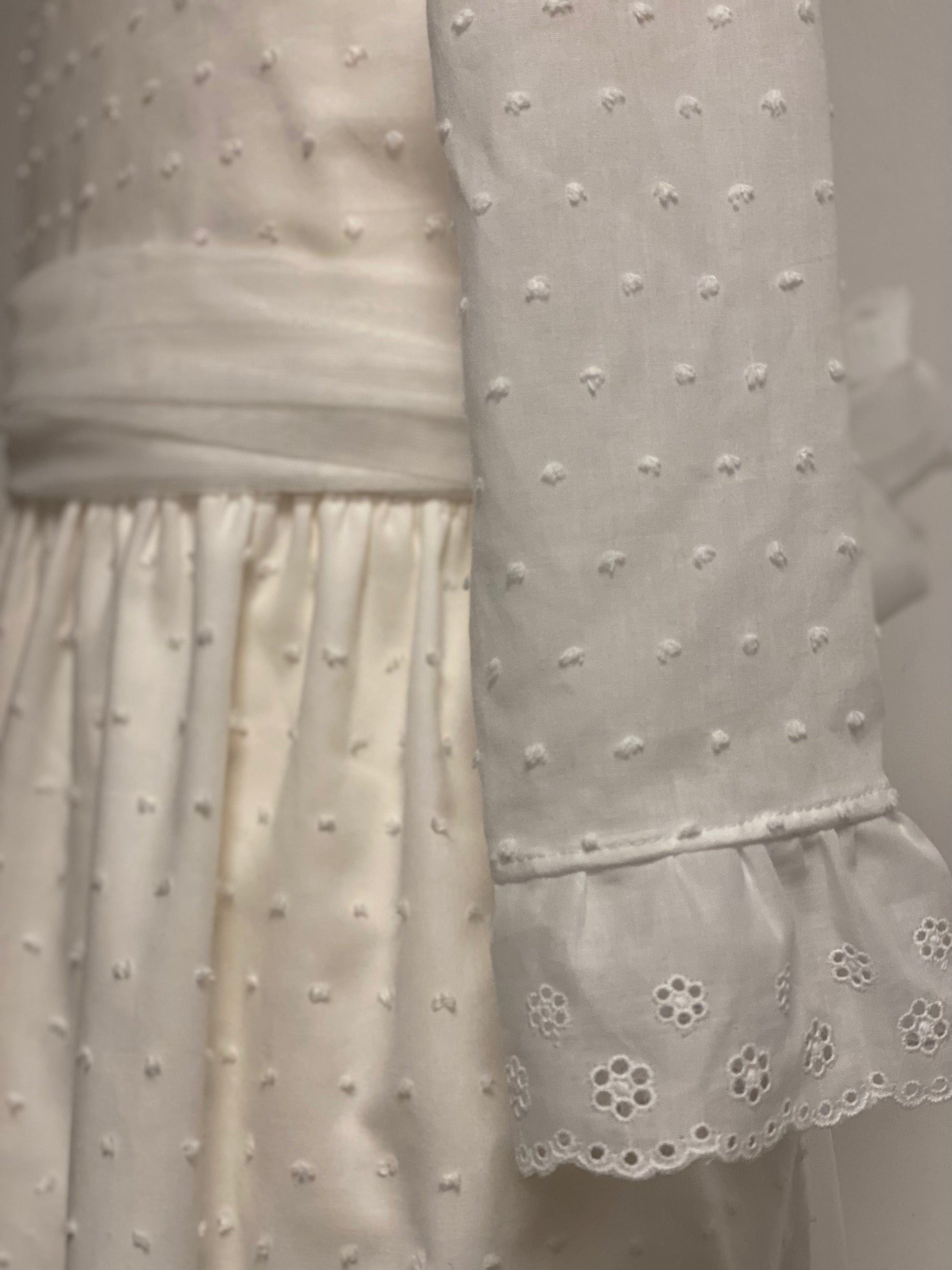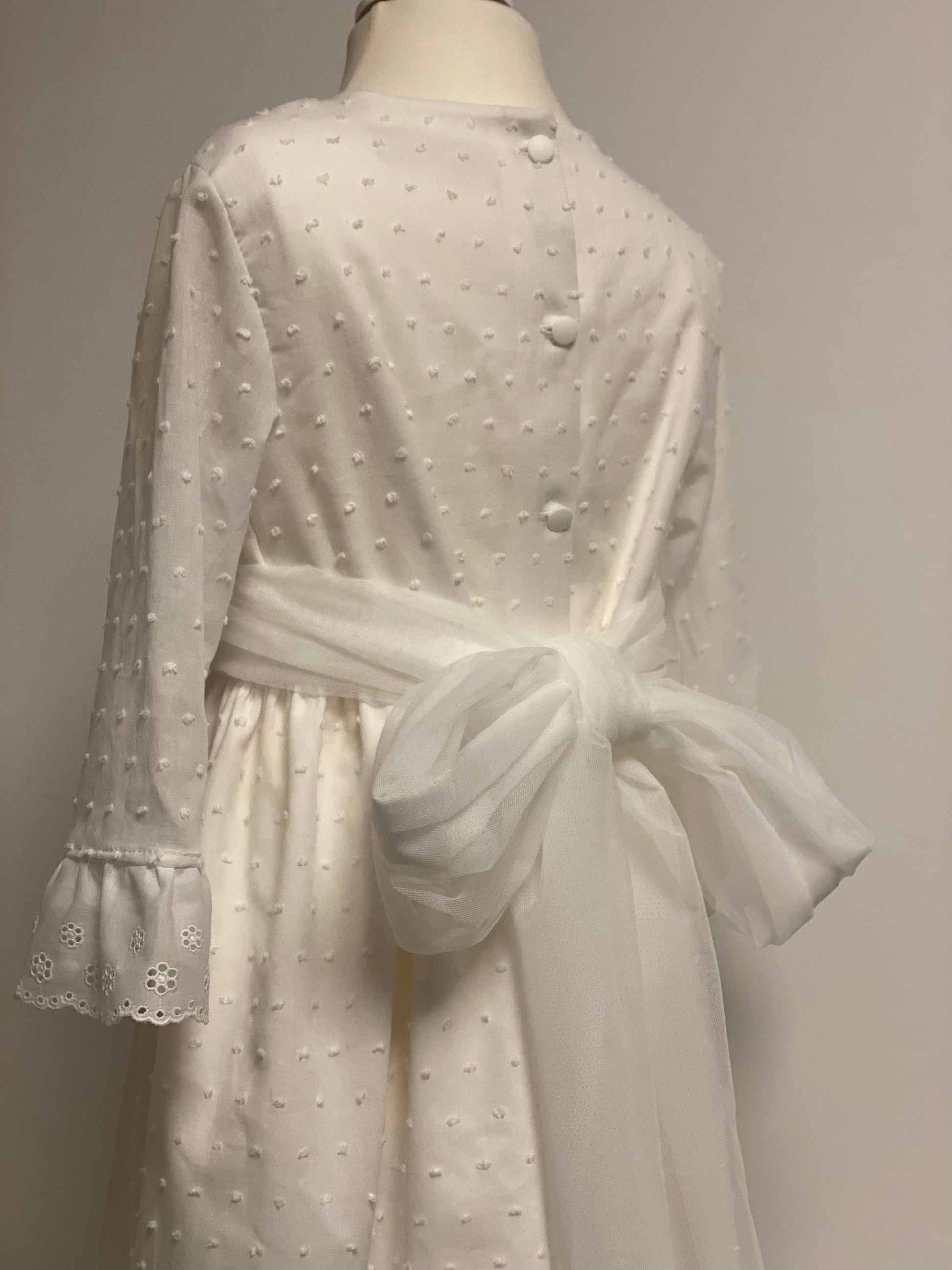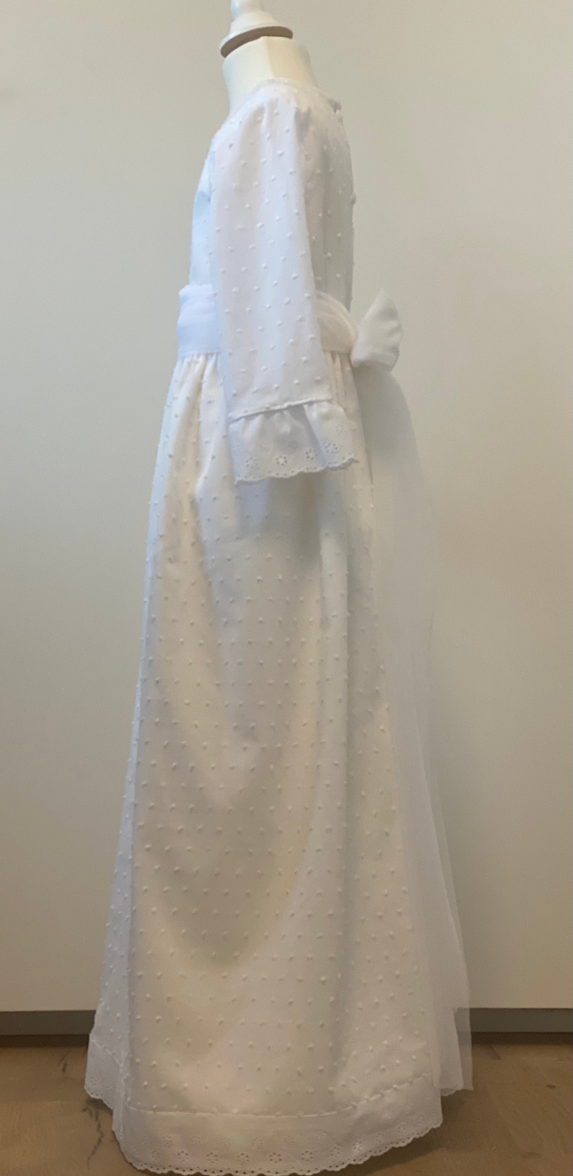 Baumwollbatist trifft Baumwollspitze. Ganz fein, reinweiß und weich zu tragen, gefüttert mit Baumwolle und mit einem Tüllband verziert ist dieses Kleid etwas kleiner geschnitten.