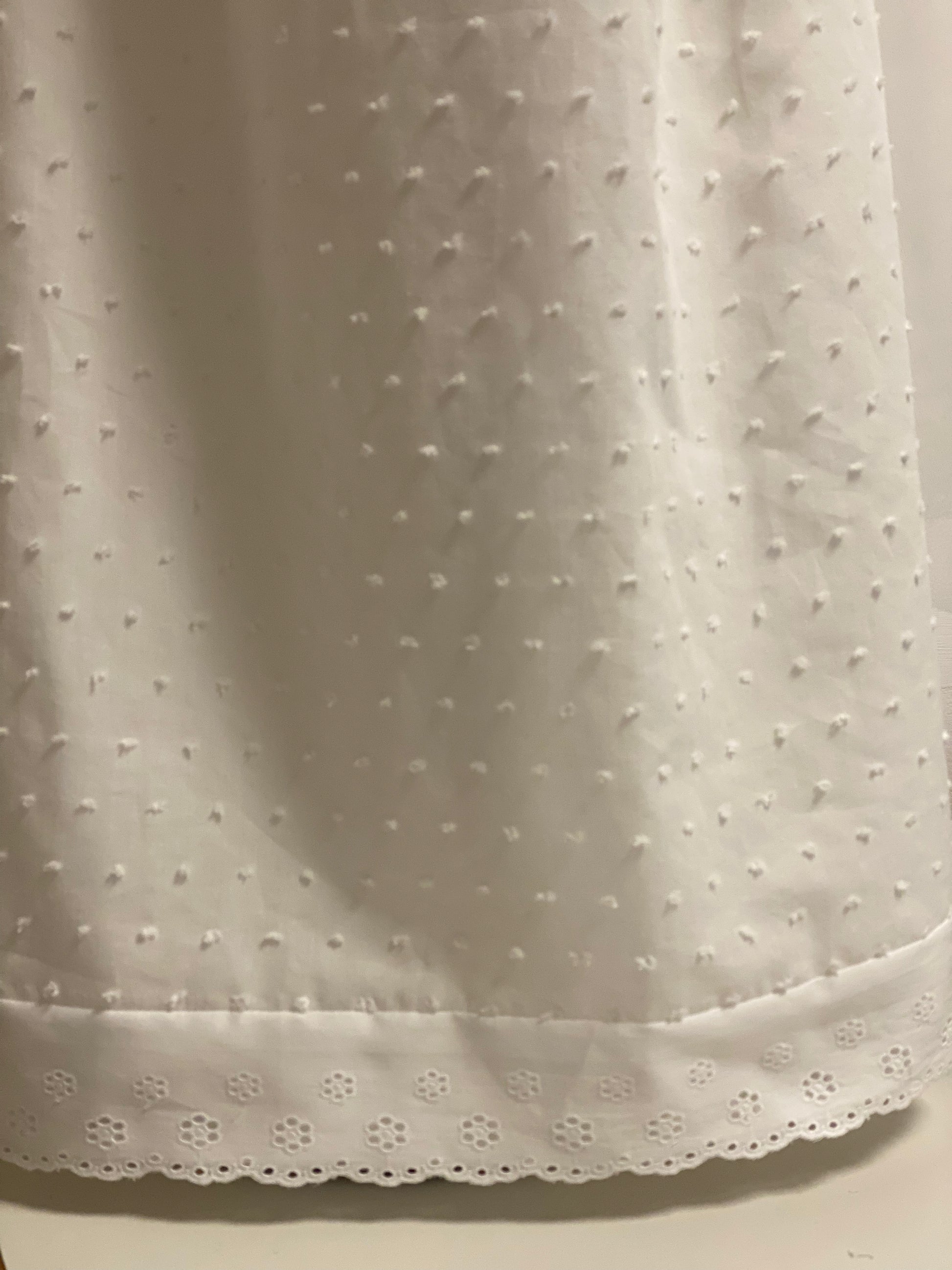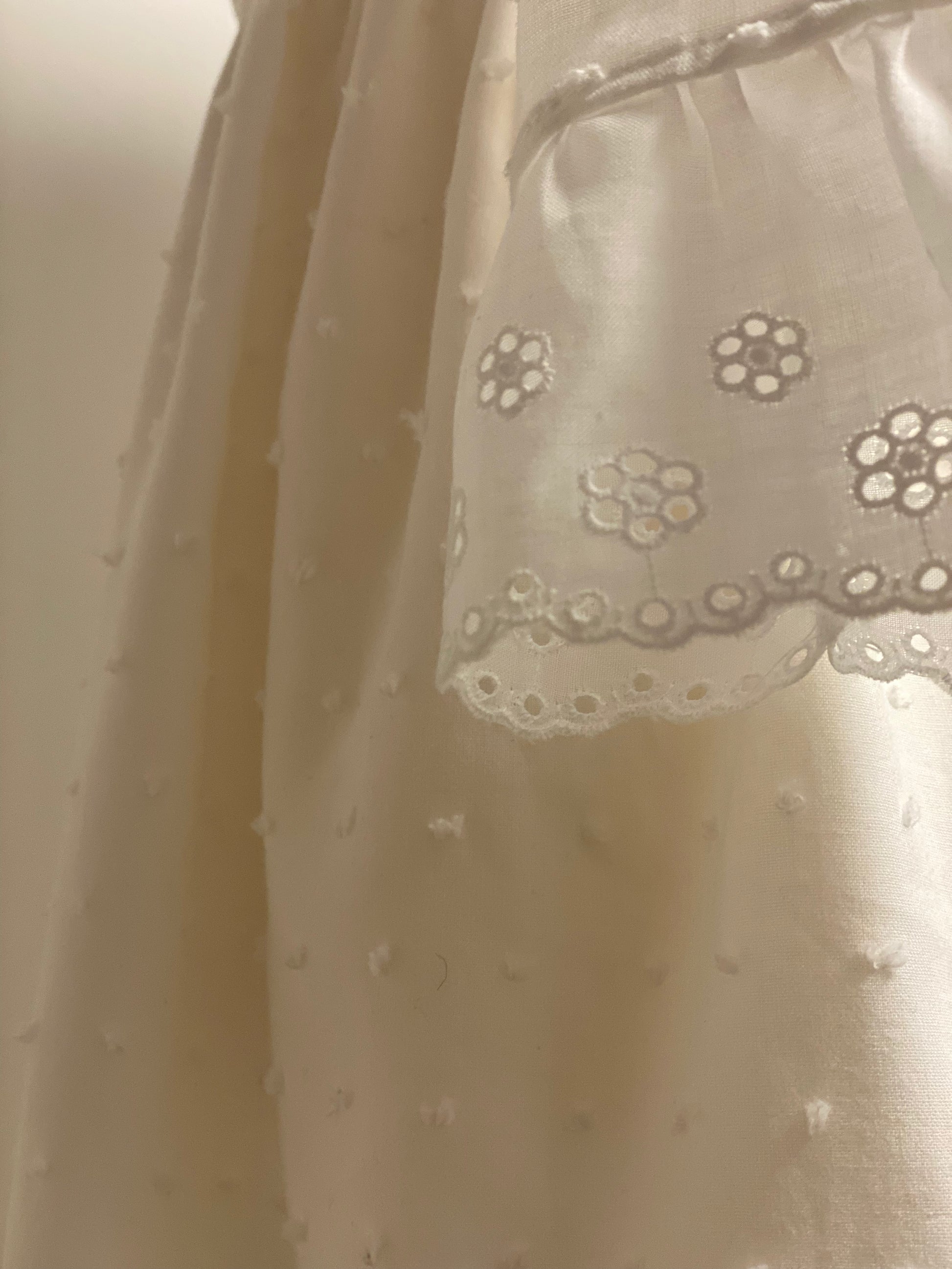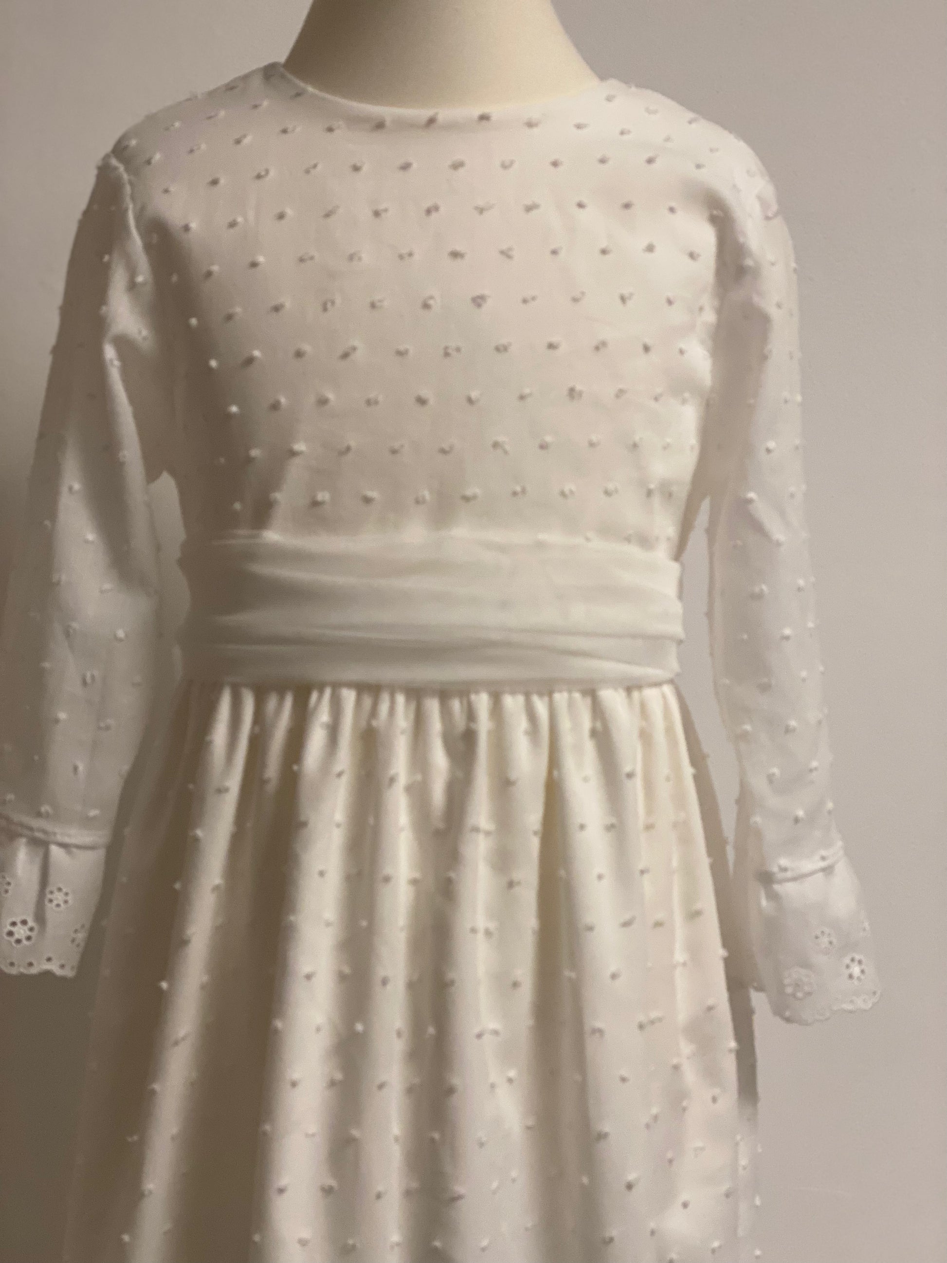 Baumwollbatist trifft Baumwollspitze. Ganz fein, reinweiß und weich zu tragen, gefüttert mit Baumwolle und mit einem Tüllband verziert ist dieses Kleid etwas kleiner geschnitten.