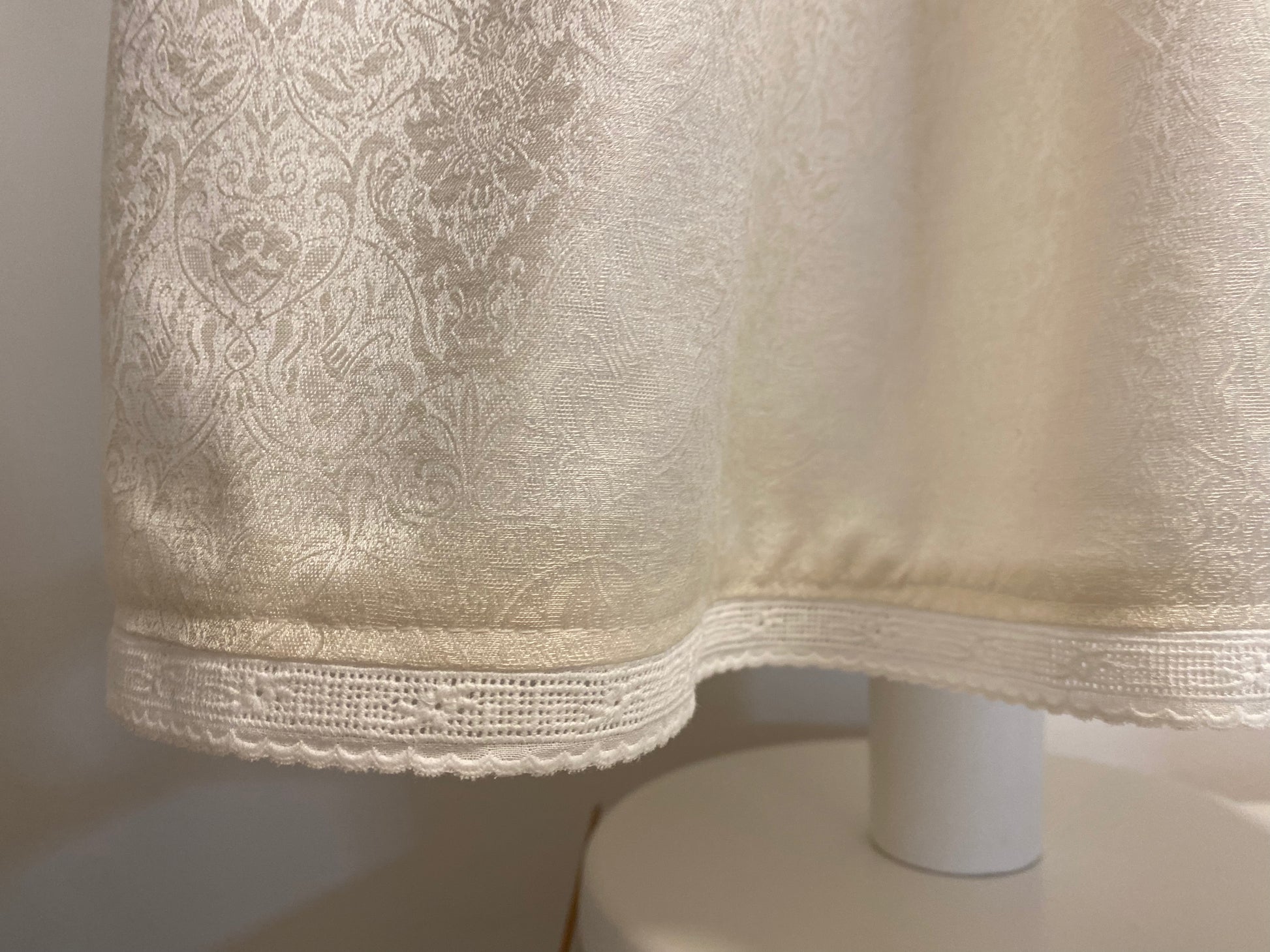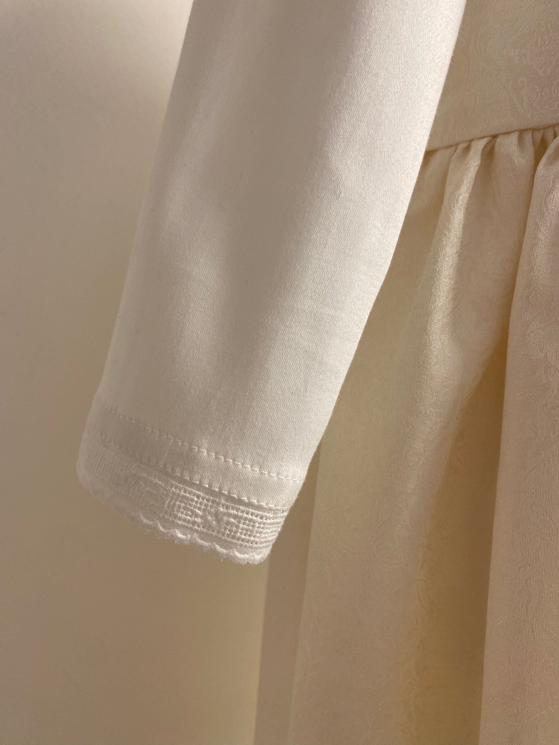 Gewebt und genäht in Österreich. Dieses bezaubernde Kleid ist mit Stoffen von Jilsilk und einer Lustenauer Baumwollspitze genäht. Schlicht, glänzend, elegant und einfach. 3/4 Ärmel und bodenlang. Auf der Rückseite mit einem verdeckten Nahtzipp zu schließen. Gefüttert mit Baumwolle.