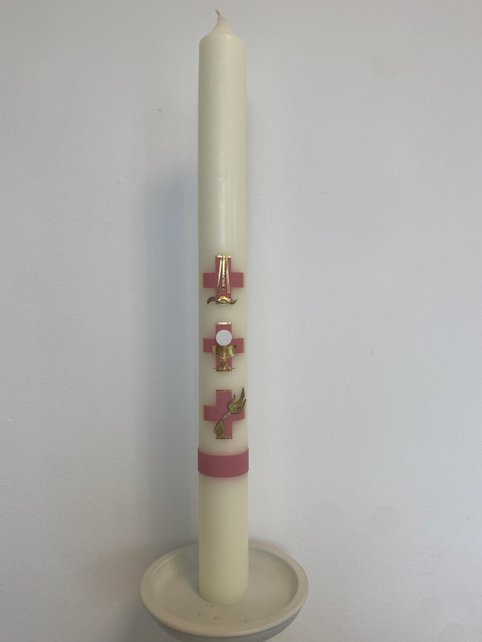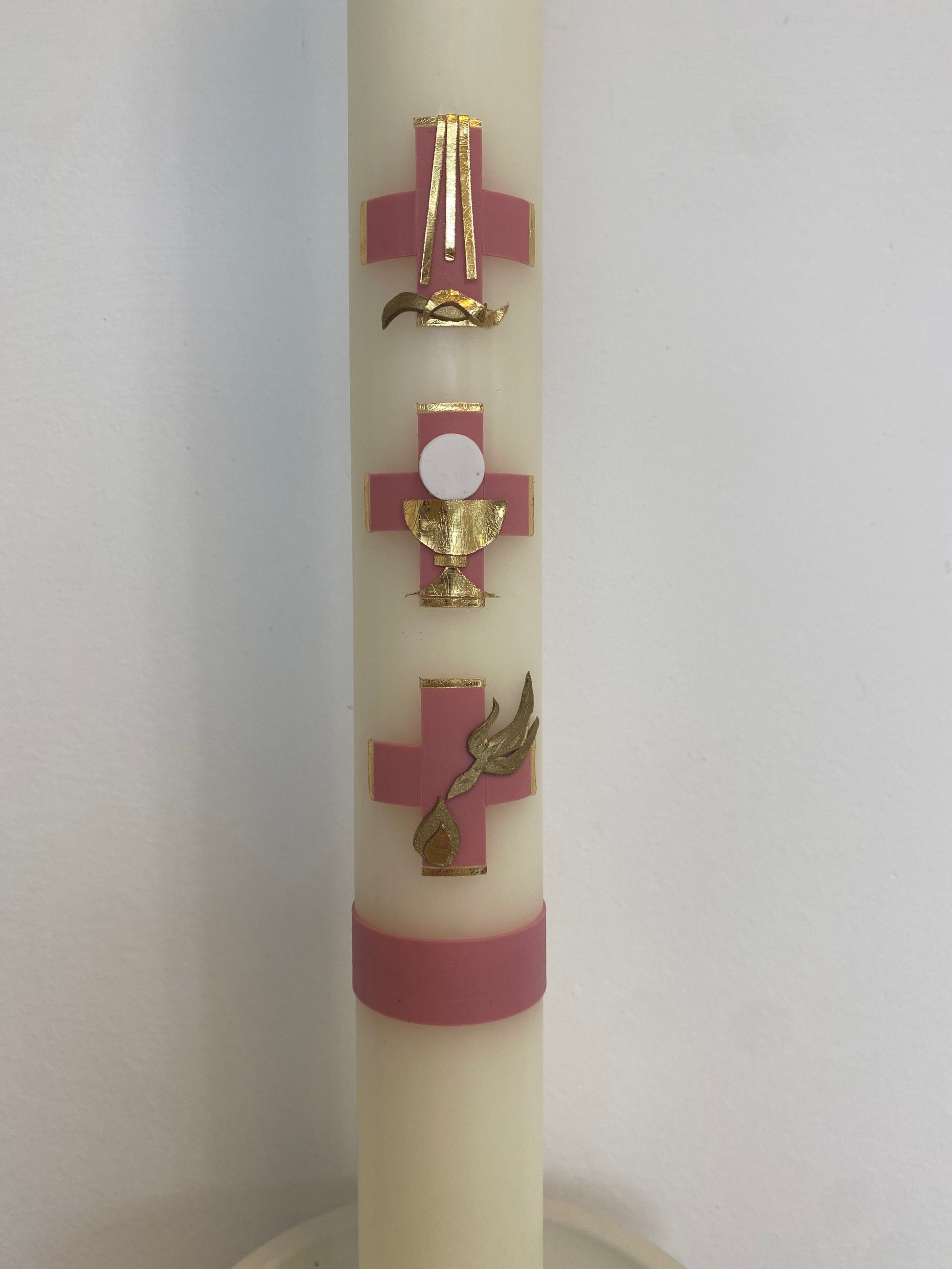 Dies ist eine besondere Taufkerze aus einem Zisterzienserkloster. Liebevoll handgefertigt von den Schwestern. Die 3 Symbole stehen für die Taufe, die Erstkommunion und die Firmung.