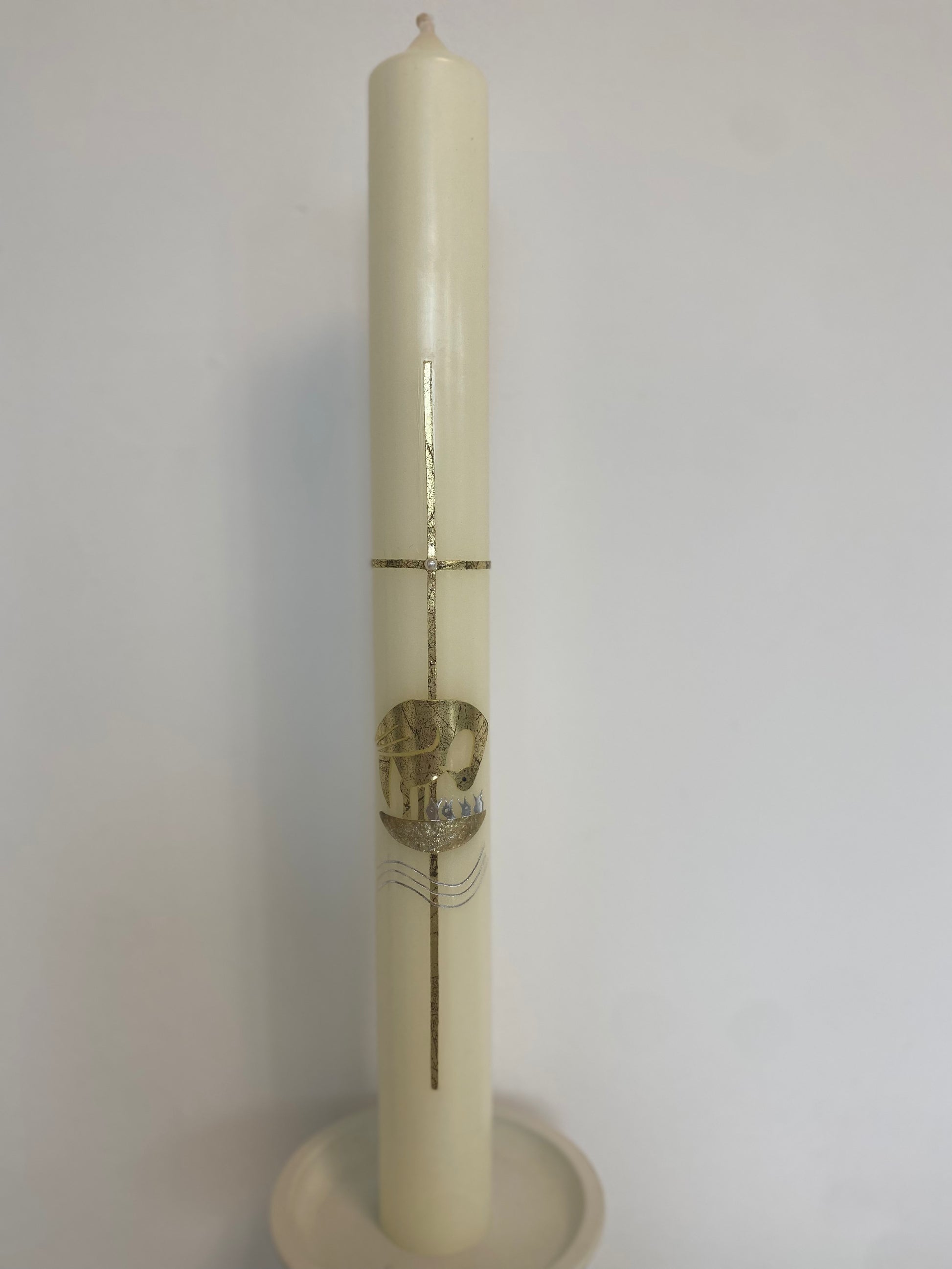 Dies ist eine besondere Taufkerze aus einem Karmelkloster. Liebevoll handgefertigt von den Schwestern. Die Kerze enthält 10% Bienenwachs.