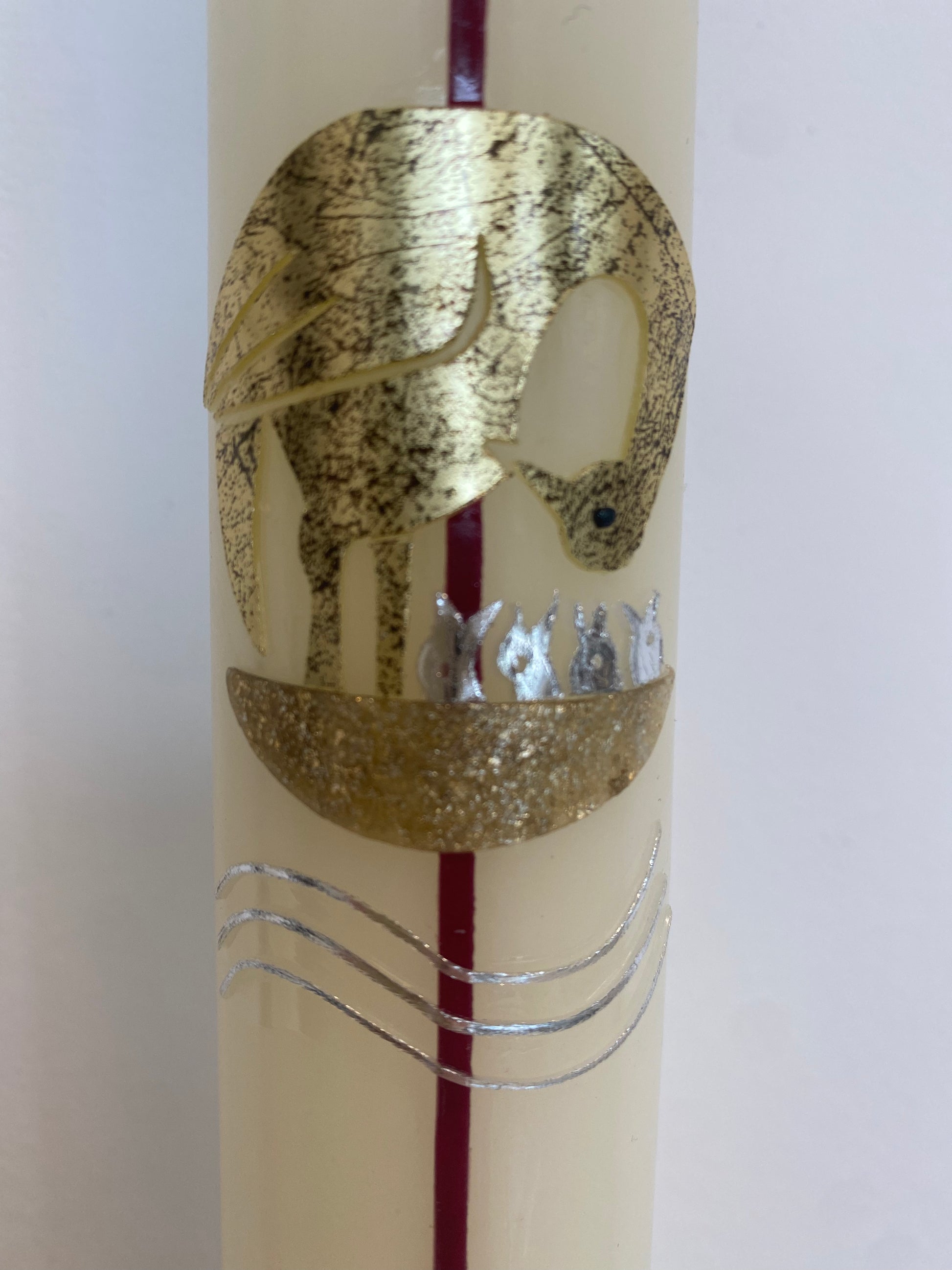 Das Taufwasser hat seinen Ursprung im Blut und Wasser der geöffneten Seite Jesu und schenkt uns Teilnahme an seinem Leben. Daran will das Pelikan-Motiv auf der Taufkerze besonders erinnern.