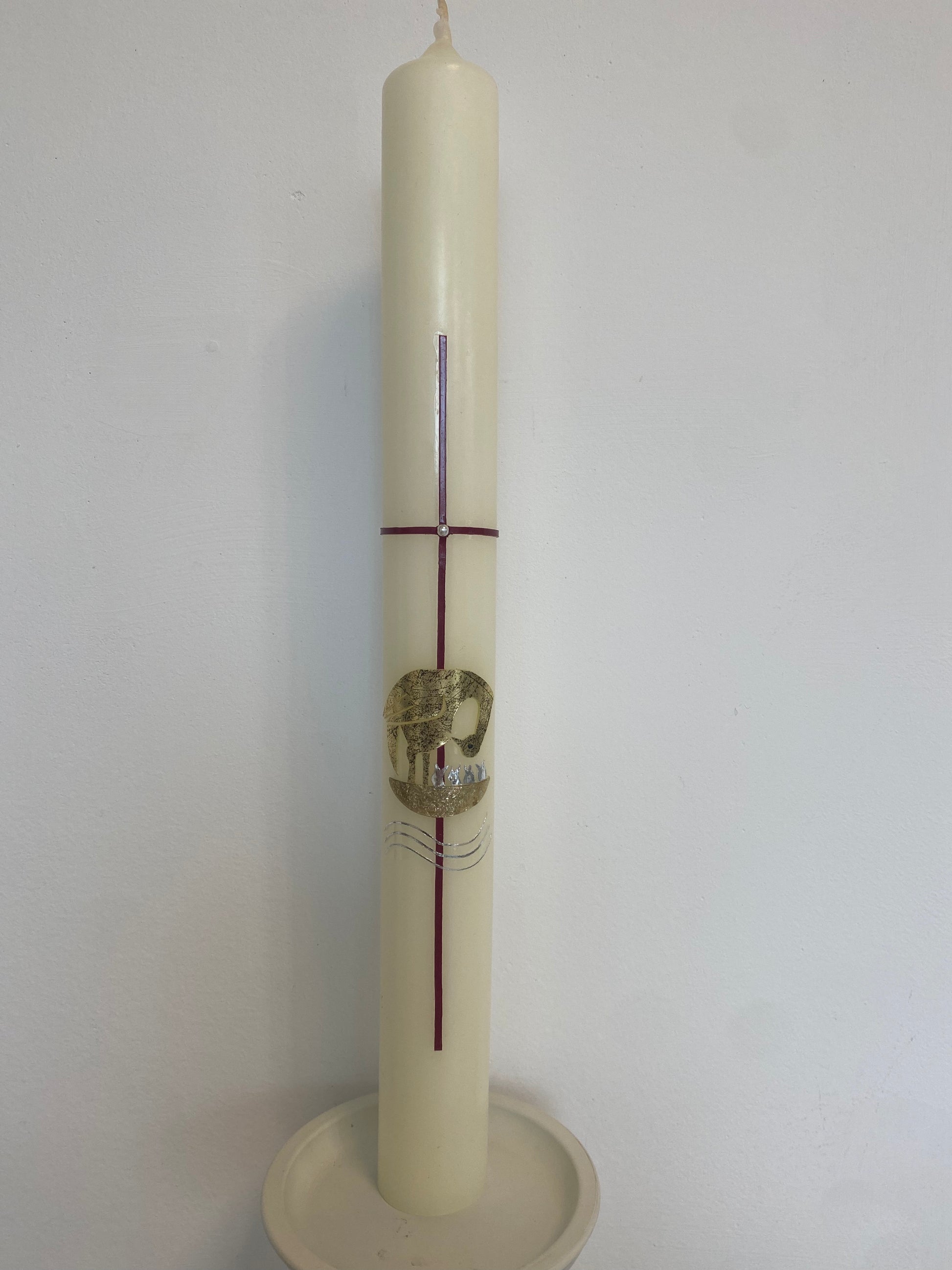 Dies ist eine besondere Taufkerze aus einem Karmelkloster. Liebevoll handgefertigt von den Schwestern. Die Kerze enthält 10% Bienenwachs.