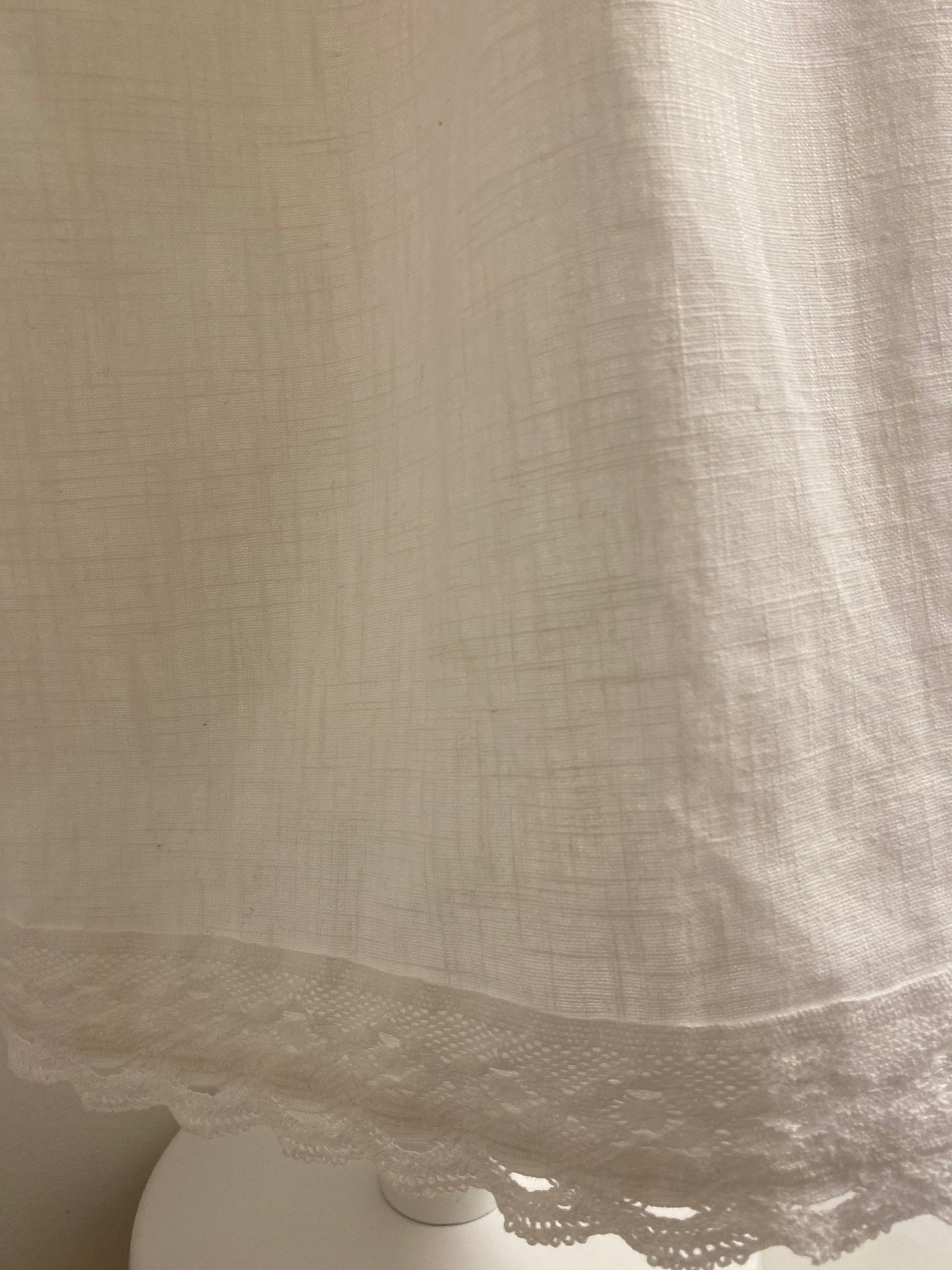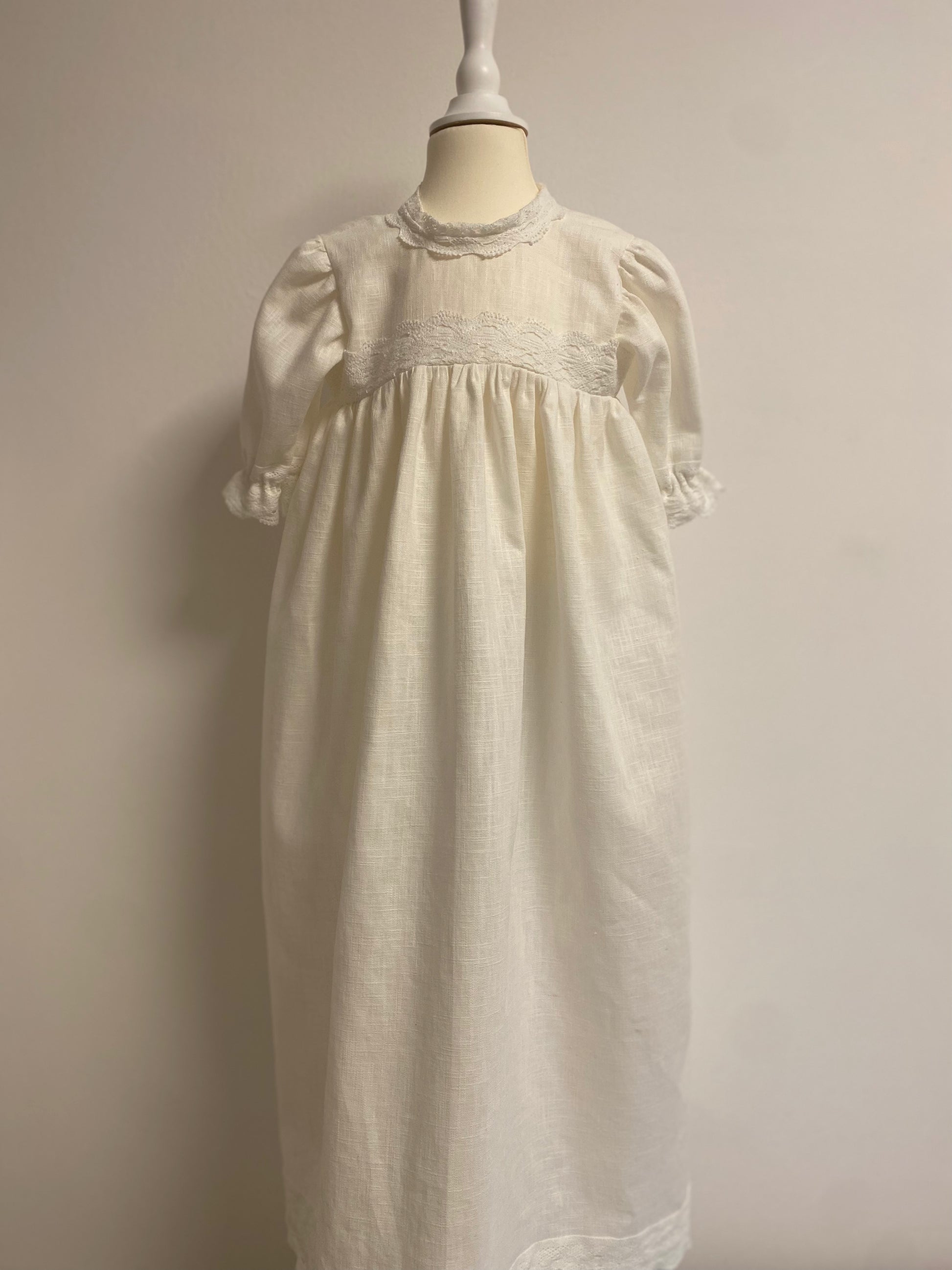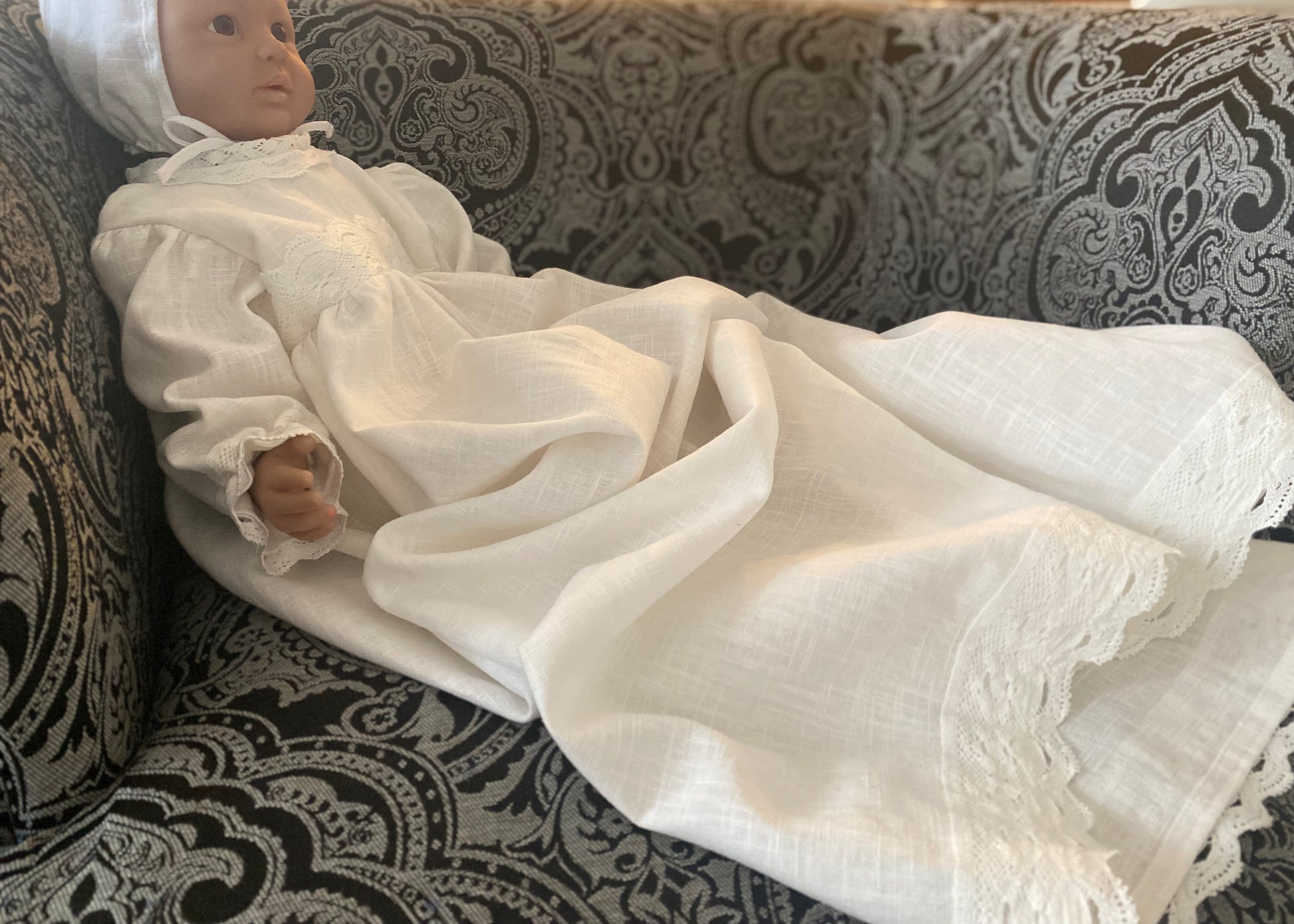 Dieses Taufkleid und das dazu passende Häubchen ist für Babys gedacht und aus hochwertigem weissen Reinleinen gefertigt. Die Passform ist jedoch etwas großzügig. Es ist mit einer Baumwollspitze veredelt und auf der Rückseite mit Perlmuttknöpfe zu schließen. Der Futterstoff aus feiner Baumwolle ist besonders weich und angenehm zu tragen, während das schlichte Design zeitlos und elegant ist. Machen Sie den besonderen Tag Ihres Kindes unvergesslich mit diesem liebevoll gefertigten Taufkleid, welches auch über Generationen weitergegeben werden kann.